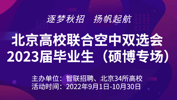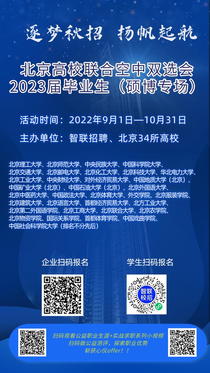 为全面贯彻落实教育部、北京市关于疫情防控工作的有关要求,更好地为用人单位和高校提供安全、便捷、高效地信息沟通和双向选择平台,抓住当前毕业生求职的关键期、冲刺期,全力促进高校毕业生顺利毕业、尽早就业。智联招聘联合北京32所高校于2022年9月1日至10月30日举办“逐梦秋招 扬帆起航北京高校联合空中双选会2023届毕业生(硕博专场)”活动。 活动期间大量覆盖客户,积极与学生进行互动,促进并解决用人单位和学生的双向需求。