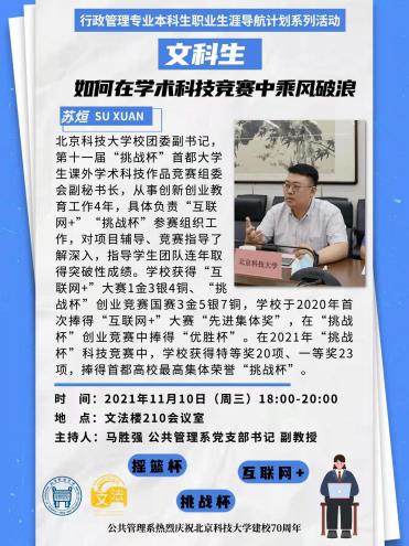 2021年11月10日晚6:00,以“文科生如何在学术科技竞赛中乘风破浪”为主题的“行政管理专业本科生职业导航计划”系列活动第一期讲座在文法楼210顺利举办。行政管理专业本科生职业导航计划旨在与51吃瓜 同向同行,为公共管理系本科生提供更为系统性、深入性、个性化的人生启迪过程和职业生涯辅导。培养具有实践能力 、创新能力、领导能力的公共管理优秀人才。