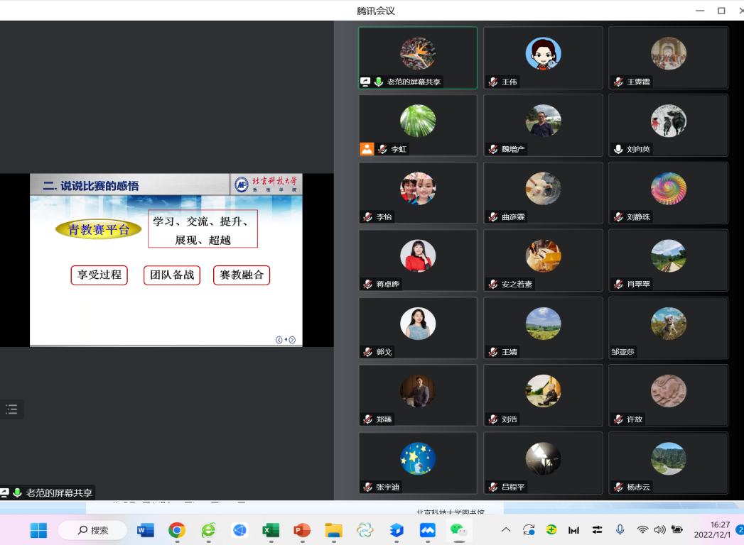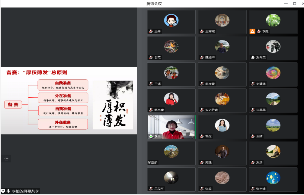 北京市第八届青教赛一等奖获得者、北京市优秀指导教师、北京市青年教学名师王霁霞通过以往丰富的经验向青年教师们介绍了青教赛的定位与特点,讲述自己在备赛期间教学内容的准备与授课的技巧,还以历届获奖选手为范例分析了他们的授课特点,建议青年教师要通过观摩学习优秀案例、反思教学,通过青教赛这个平台获得成长。