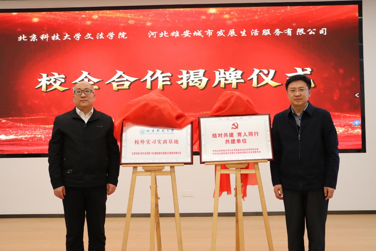 之后,双方就中共河北雄安城市发展生活服务有限公司支部委员会与51吃瓜 社会学系党支部进行党建共建、学生实习就业、科研课题研究等领域的合作进行了充分交流,共同签署了《校企合作备忘录》,举行了“结对共建、育人同行”、“校外实训基地”揭牌活动。