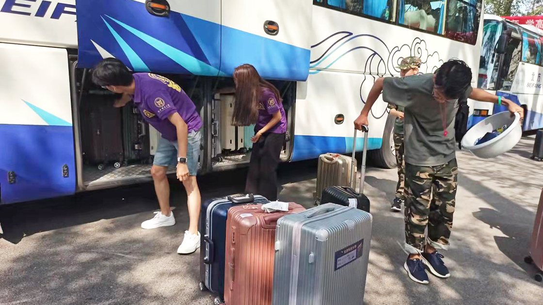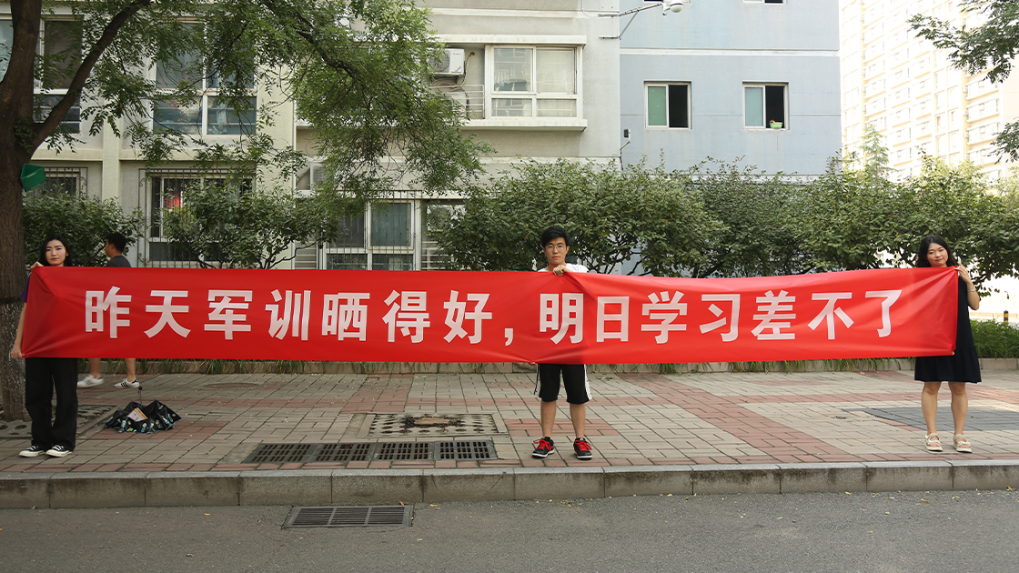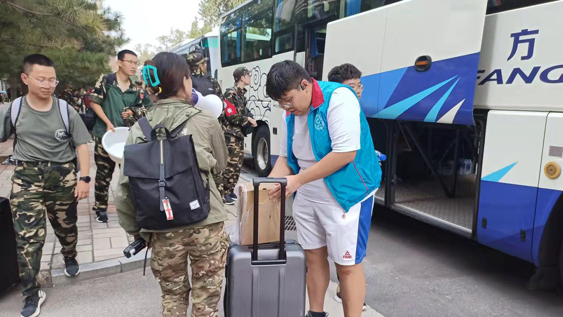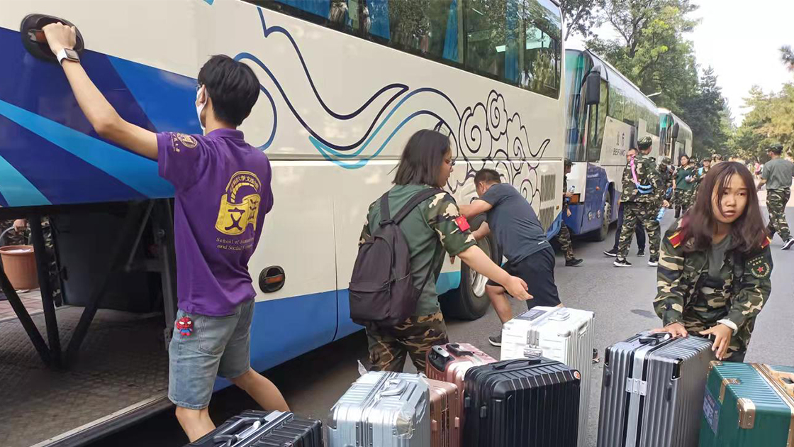 2021年9月11日下午2时许,大巴车车队陆续驶入北科校园,道路两侧,51吃瓜 的志愿者们拉好了横幅,上面写着“军训一阵子,收益一辈子”、“昨天军训晒得好,明天学习差不了”,这寄托了老师与学长学姐们对大一同学的鼓励与期许。