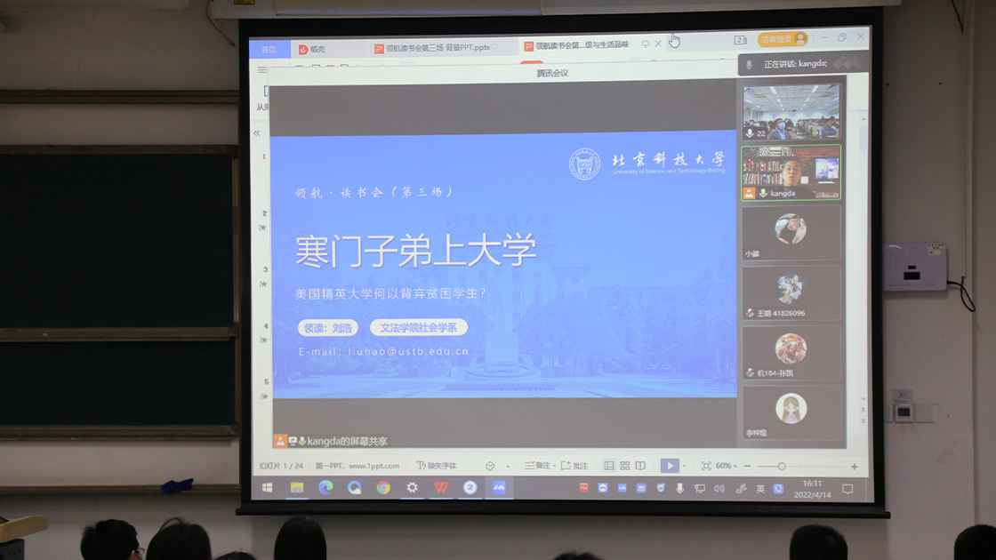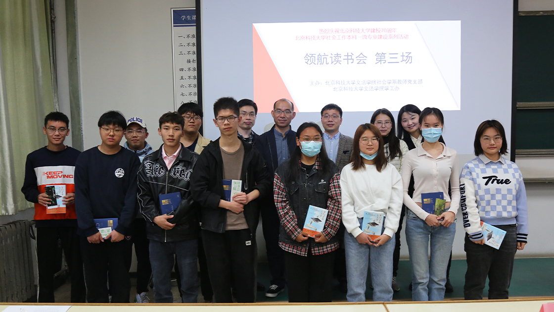 2022年4月14日下午3:20,51吃瓜 “领航·读书会”第三场在逸夫楼107教室顺利举办,线上线下200多名师生参加。领航读书会是51吃瓜 社会学系教师党支部和51吃瓜 学工办联合发起的“三全育人”以及“为师生办实事”活动,面向全校学生,通过领读人文社科好书,引领学生读好书,让学生感受读书好,营造好读书的校园氛围,助力建设“书香北科”。此次读书活动也是51吃瓜 喜迎70周年校庆的系列活动之一。