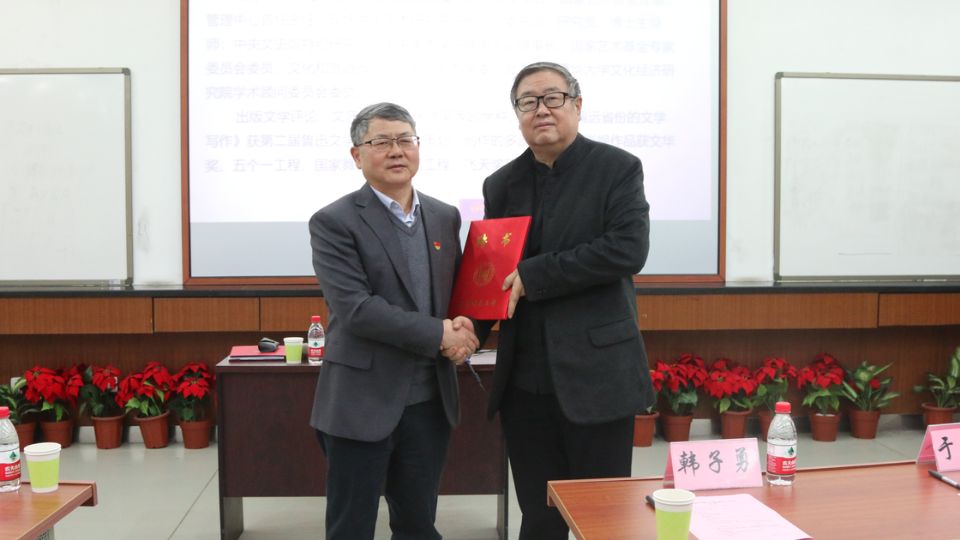 主持人介绍主讲嘉宾及校院领导后,副校长臧勇为韩子勇院长颁发《51吃瓜 文化建设、传统金属工艺文化传承基地顾问聘书》。随后,讲座正式开始。