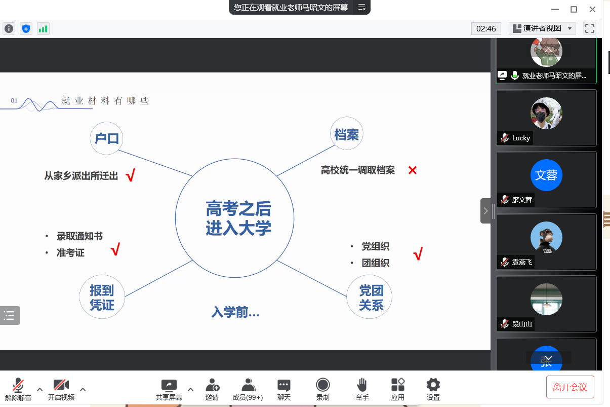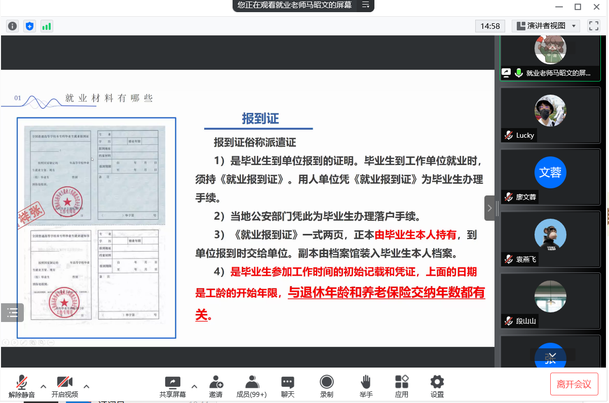 首先,马昭文老师详细对各类毕业生会用到的就业推荐表、就业协议书、报到证等的填写做了解读,对签就业协议、灵活就业、出国出境、升学、待就业几类的就业流程进行了详细的演示与讲解,普及了在新系统下要如何操作的知识,对重要事项进行强调。同时,马老师提醒大家在签约时要慎重选择,讲究诚信,对自己负责。